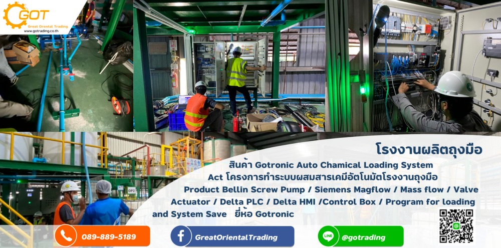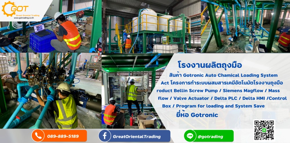 Act. โครงการทำระบบผสมสารเคมีอัตโนมัตโรงถุงมือProduct Bellin Screw Pump/ Siemens Mag flow / Mass Flow/Valve Actuator/Delta PLC/ Delta HMI/ Control Box/ Program for loading and System Save ยี่ห้อ GOTRONIC