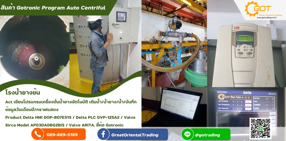 Act. เขียนโปรแกรมเครื่องปั่นน้ำยางอัตโนมัติ เติมน้ำ/น้ำยาง/น้ำ บันทึกข้อมูล วันเดือนปี/กราฟแสดงสินค้า Gotronic Program Auto CentrifulProduct Delta HMI DOP-BO7E515/Del PLC DVP-12SA2 / Valve SircaModel : APO3DAOBG2BIS / Valve Airtaยี่ห้อ Gotronic